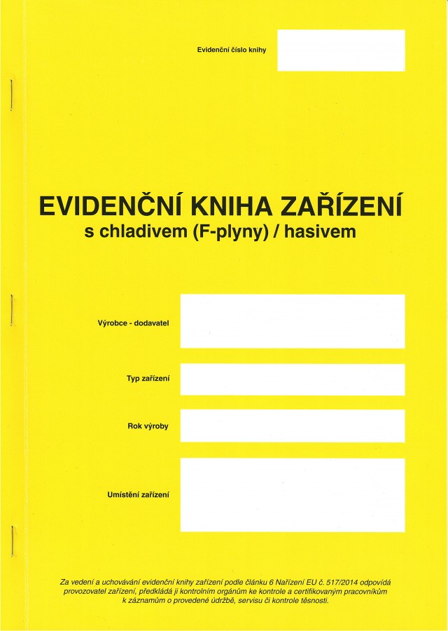 Evidenční kniha musí obsahovat datum vyhotovení, jméno a adresu provozovatele zařízení a také druh a velikost náplně chladiva. V knize musí být dále zaznamenána data provedených kontrol s razítkem provádějící firmy a také přehled o množství chladiva doplňovaného do zařízení za poslední dva roky. Do evidenční knihy se zaznamenává: